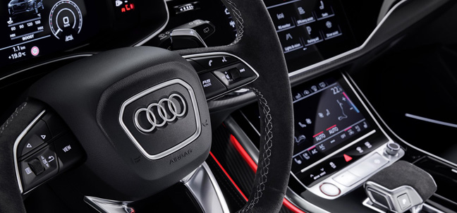 The biturbo petrol 4.0-litre V8 in the new RS Q8 is supported by a mild-hybrid system (MHEV) that uses 48-volt electrics. It features a belt alternator-starter connected to the crankshaft that, during deceleration and braking, can recover up to 12kW of power and store it in a compact lithium-ion battery. It can also coast for up to 40 seconds with the engine off, restarting instantaneously, when the accelerator is actuated. The system is connected to the camera sensors for even greater efficiency. When stopped, the engine starts again, while the brake pedal is still depressed, as soon as the front camera detects that the vehicle in front of the new RS Q8 begins to move.
