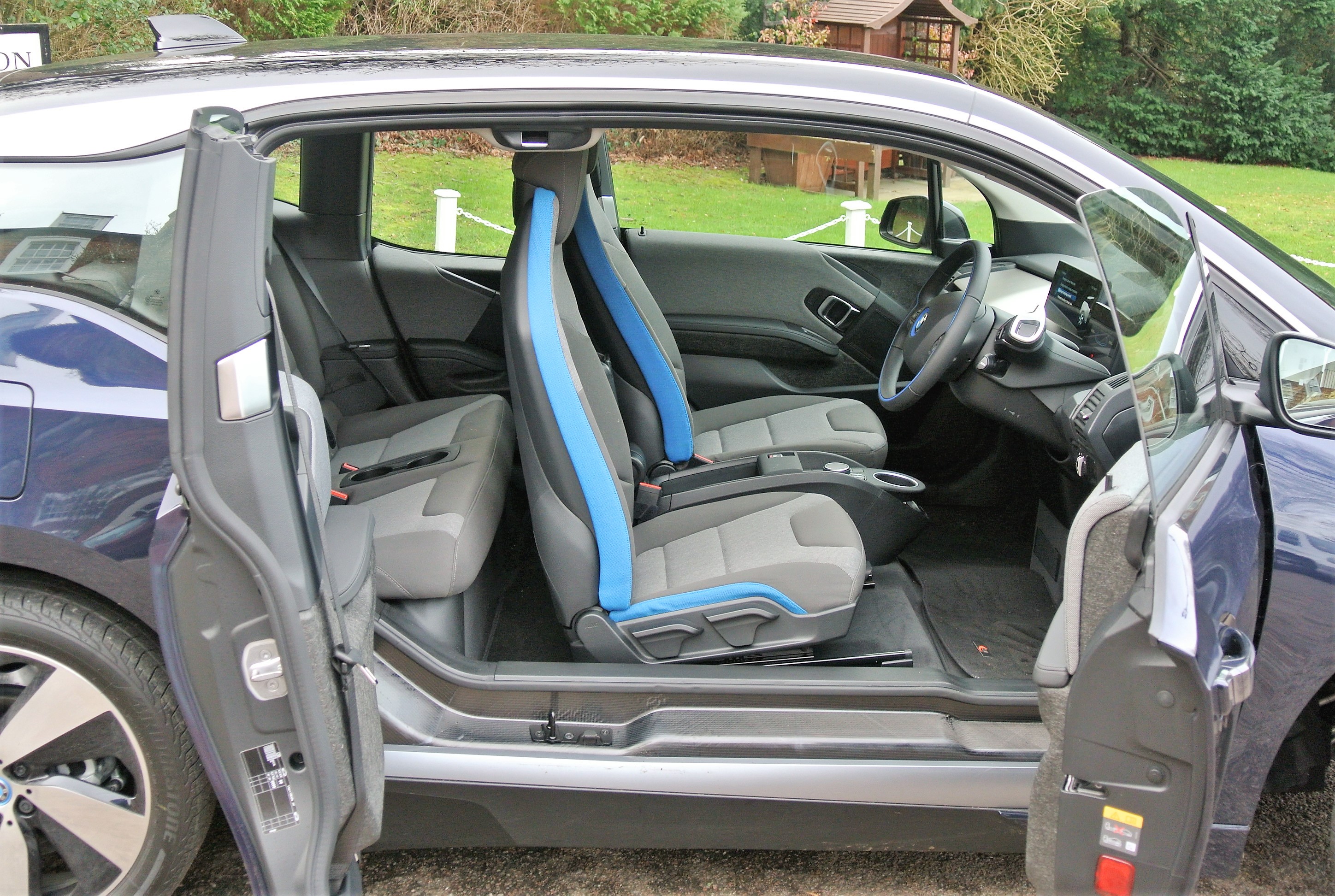 The i3 is skinny, not just in its specially developed, Bridgestone ultra-narrow tyres and lightweight 19.0-inch diameter alloy wheels, but also in its unusual five-door body. On a protective surrounding frame that is not dissimilar to that employed on the steel-framed smart car, produced entirely from lightweight carbon-fibre instead, BMW hangs what it calls ‘coach’ doors from its framework. Largely conventional front doors, which need to be opened to ‘release’ the rear-hinged and unconventional (unless you owned a Rover 90 in 1960) back doors, open and close ‘clap-hands’ to reveal a very style-conscious interior.