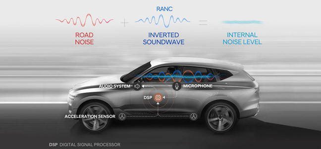 Hyundai has developed RANC, which builds on its current Active Noise Control (ANC) technology, by reducing noise actively, emitting soundwaves inverted to counteract incoming noise. It is a software-driven technology that analyses the in-cabin sound to decrease engine and road noise, rather than the passive method of blocking noise through sound insulation, which adds weight but fails to block the buzzing infrasound completely. In contrast, ANC utilises lighter parts like microphones and controllers to reduce infrasound more efficiently.