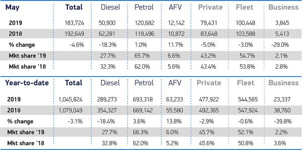 In other areas, plug-in hybrids have experienced another substantial decline, down -40.6% in May and -25.1% year-to-date. This compares with a 36.2% increase in the first five months of 2018 and is further evidence of the removal impact by government of the purchase incentive for PHEVs. While all such mobility grants need to be treated with a pinch of salt, our government’s action could be described as myopic at best.