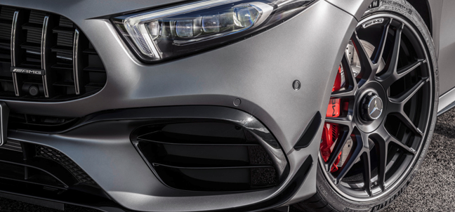 ‘Base’ variants feature 8.5J x 18.0-inch light alloy wheels in a 10-spoke design, aerodynamically optimised and painted in tantalum grey, clad in 245/40 section tyres. However, the S versions are equipped with 19.0-inch alternatives in a 5-twin-spoke design, possessing a width of 8.5 inches for the A 45 S 4MATIC+ and nine inches for the CLA 45 S 4MATIC+. Again, they are aero-optimised and painted in tantalum grey with a high-sheen finish, shod with 245/35 and 255/35 (CLA 45) tyres respectively.