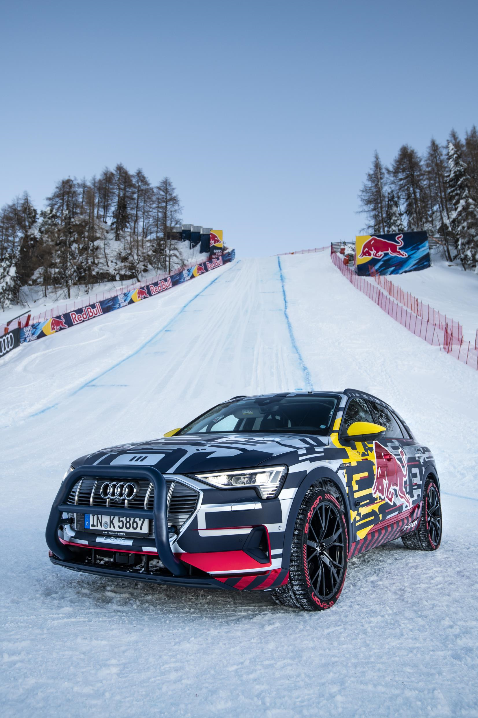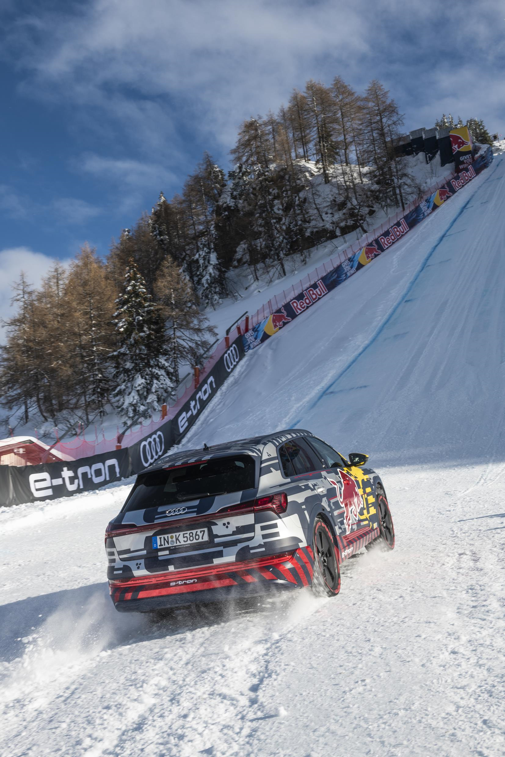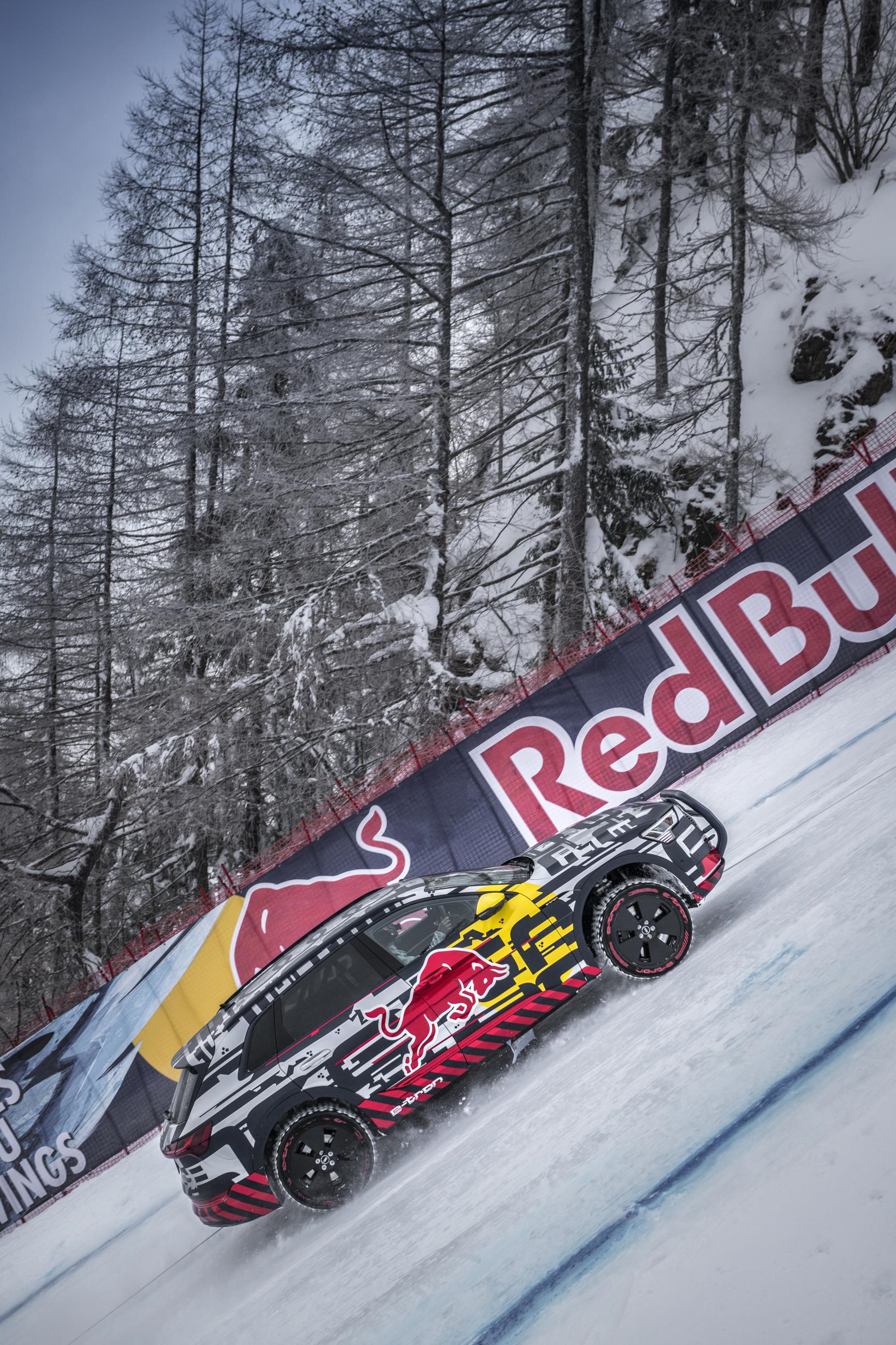 Audi had a strong partner at its side for this project, the Austrian beverage producer Red Bull. The two companies are long-standing partners of the Hahnenkamm Race and conducted this challenge together. The Audi e‑tron also illustrated the collaboration with a special set of appliques.