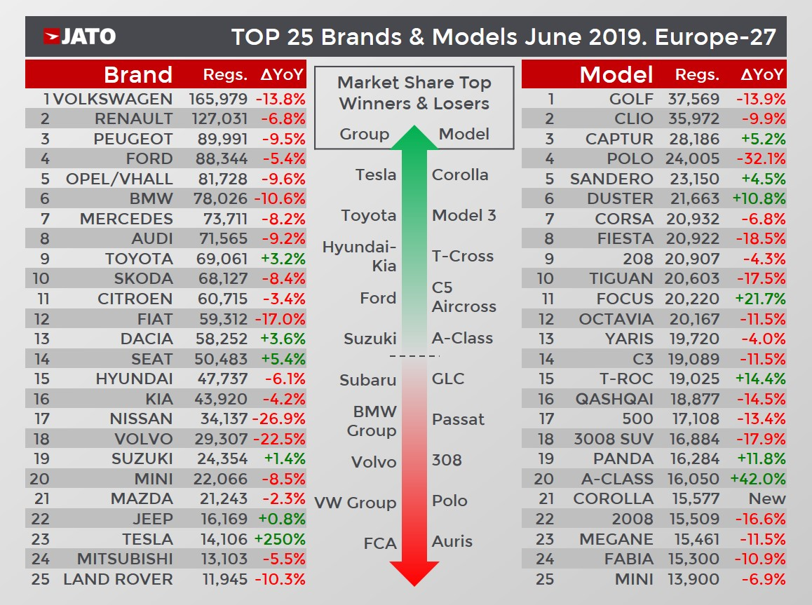 Yet, there were some success stories in June. Among all the automakers, Tesla posted the highest market share gain, as registrations increased from 4,034 units in June 2018, to 14,106 units last month. In June 2019, the compact Model 3 was Europe’s best-selling premium midsize saloon and, thanks to it, Tesla has been able to more than triple its sales in the first half of 2019.
