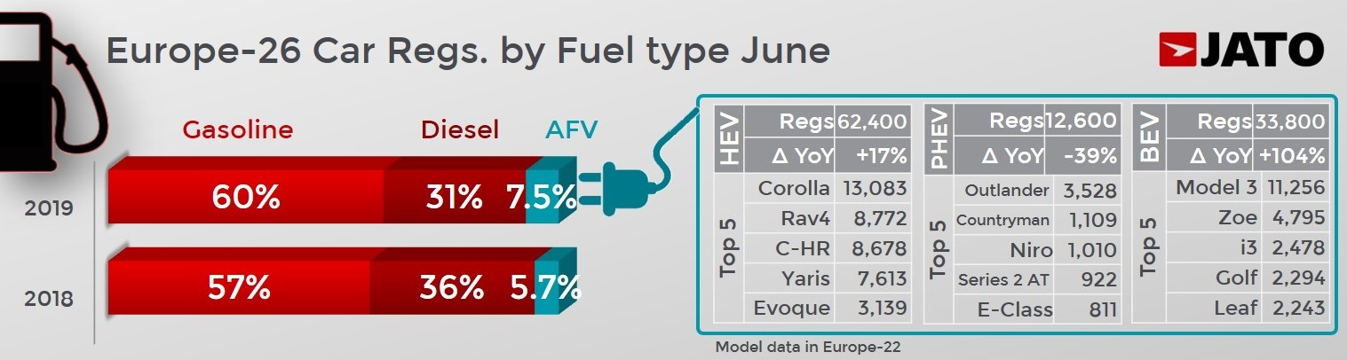 Lower consumer confidence is affecting diesel car registrations and is particularly challenging in Scandinavia (-52%; 20,092 units), where EVs continue to increase their market share (20,182 units). The Swedish record in June 2018 came ahead of a new tax hike that hit the market in July.