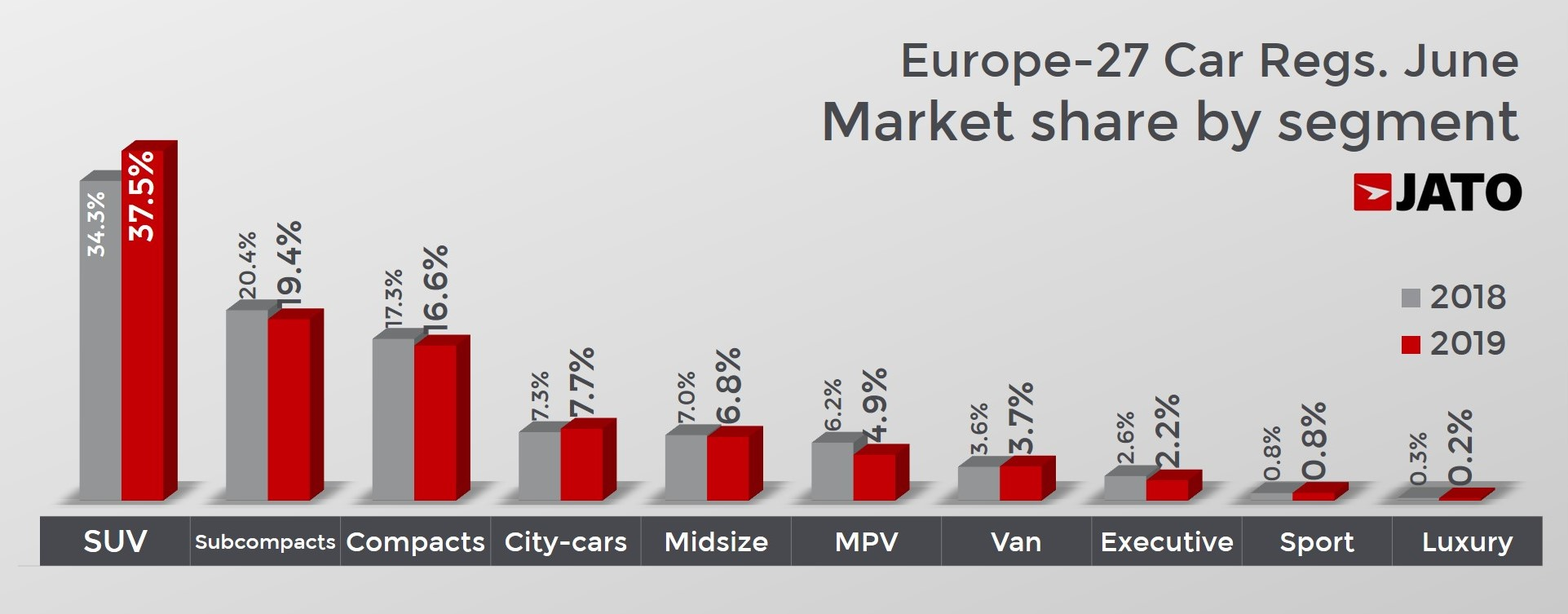 More worrying of June’s results is the slowdown for SUVs, which totalled 556,400 units during the month, up by only 0.7% compared to the 552,500 units of June 2018. Two factors explain the limited growth: 1. Higher costs of SUVs and 2. Possible SUV peak being reached. If the latter is the case, Europe could be losing its main driver of growth.