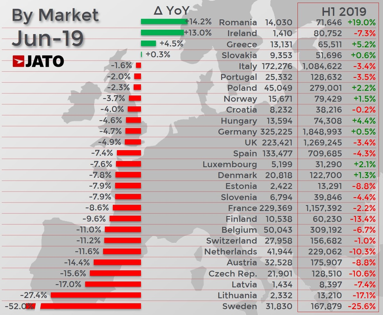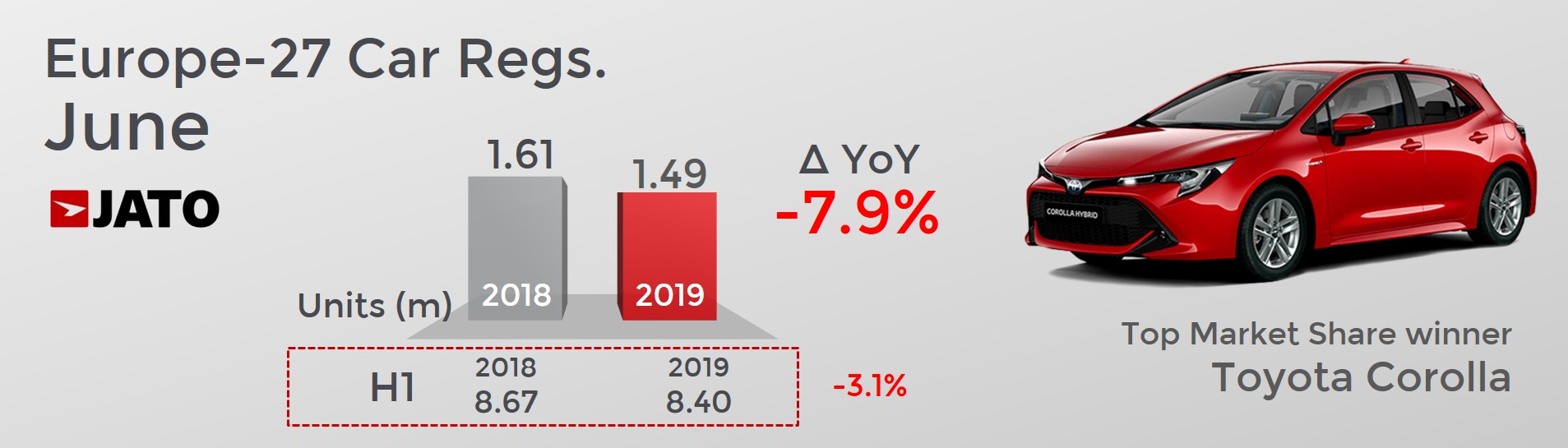 Following two consecutive months of growth, the European new car market dropped 7.9% in June 2019 (compared with June 2018) as 1.49m vehicles were registered. Only four out of the 27 markets included in JATO’s analysis posted growth but counted for a marginal 2.6% of total registrations.