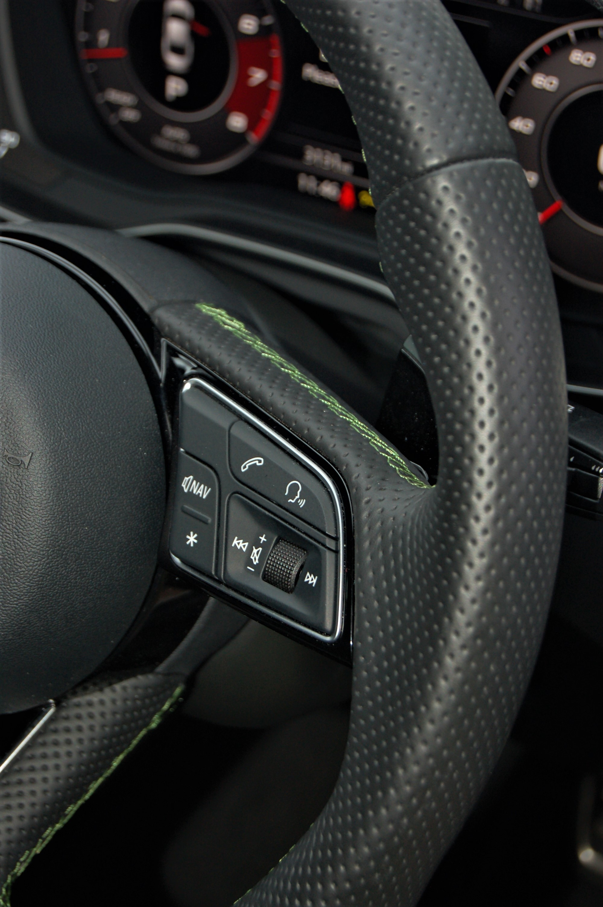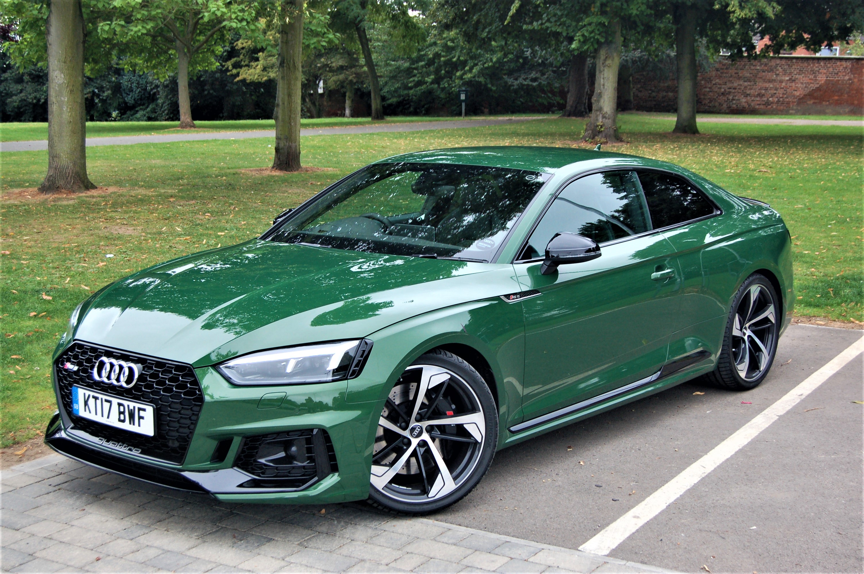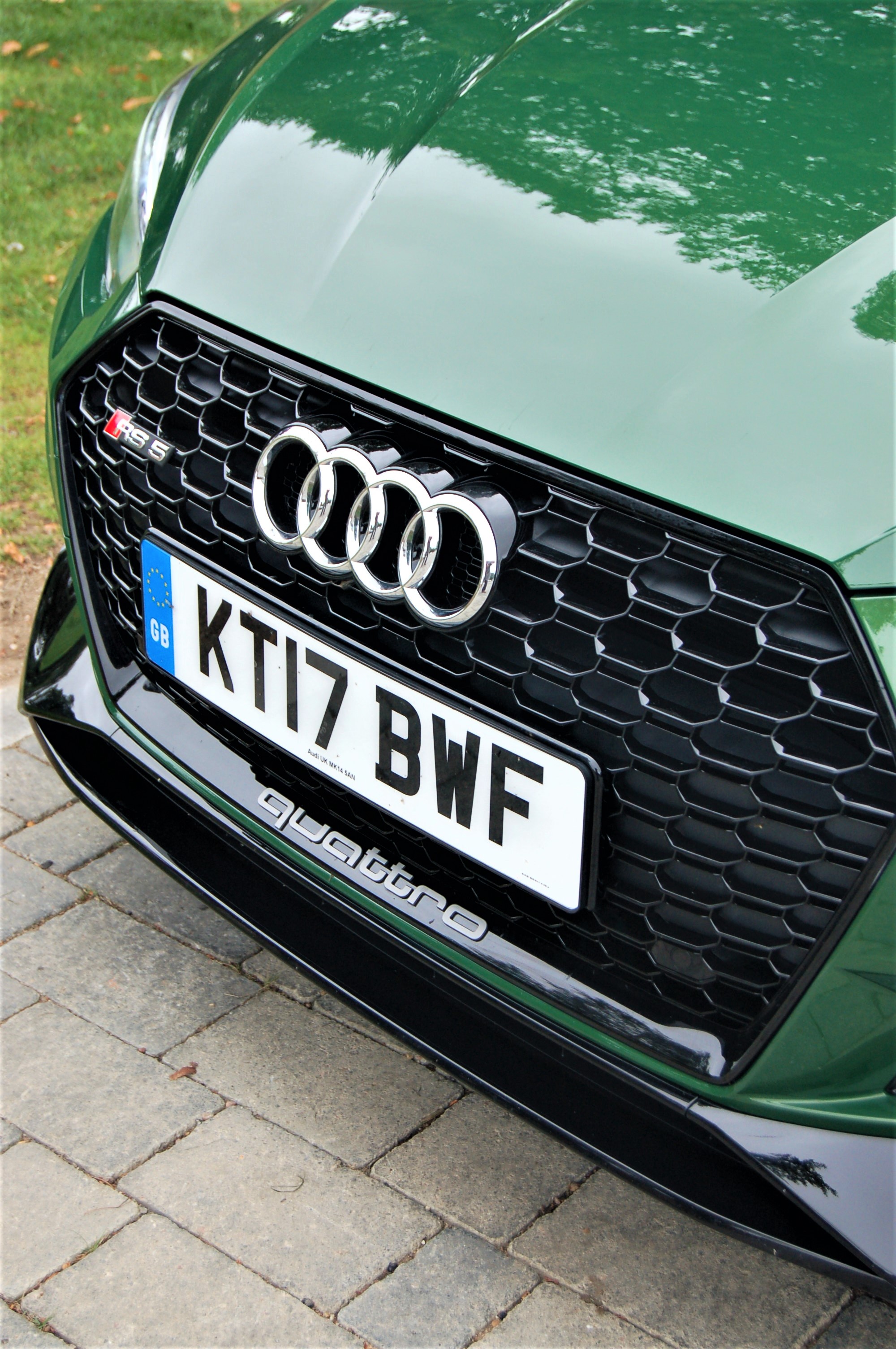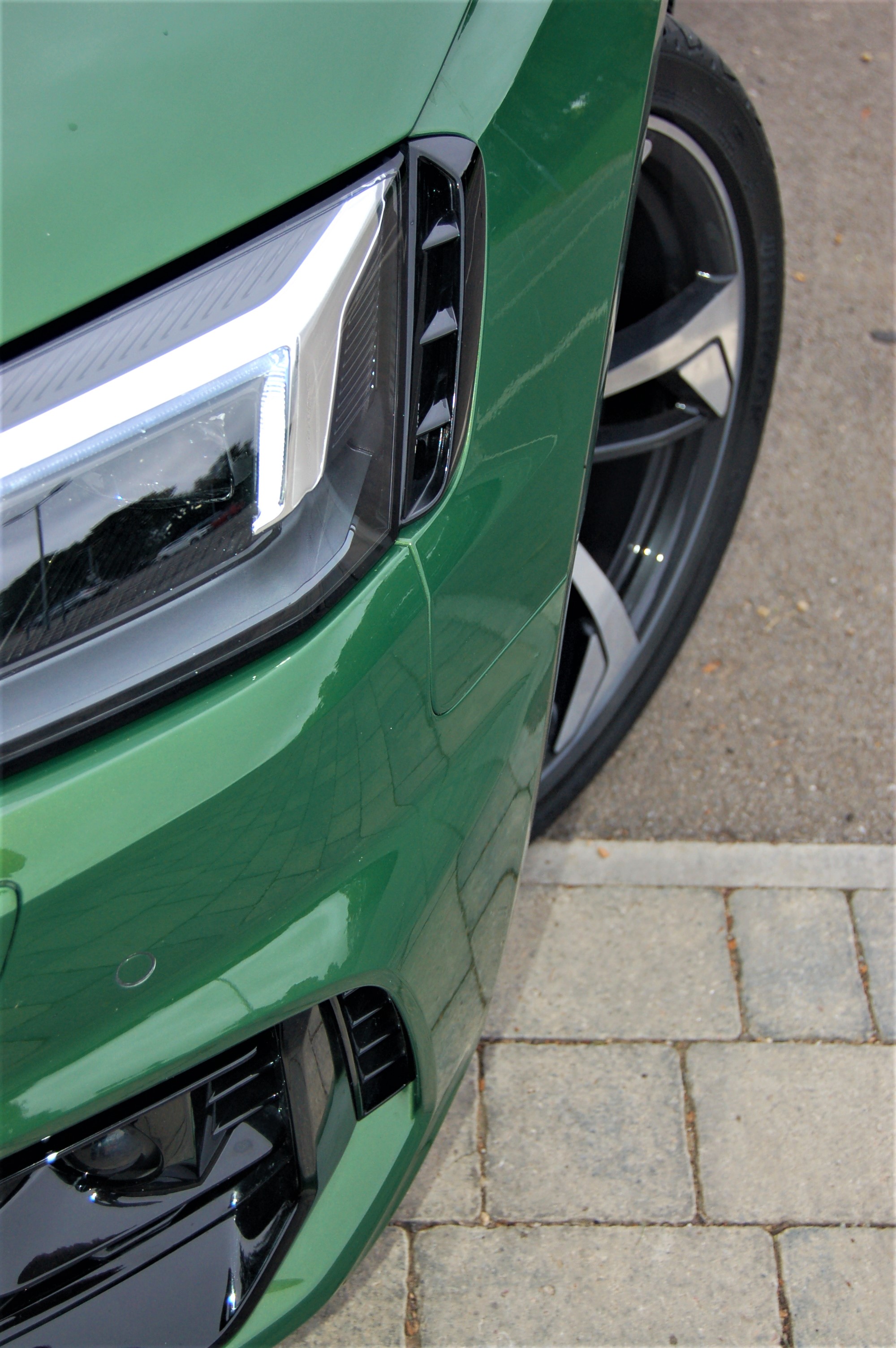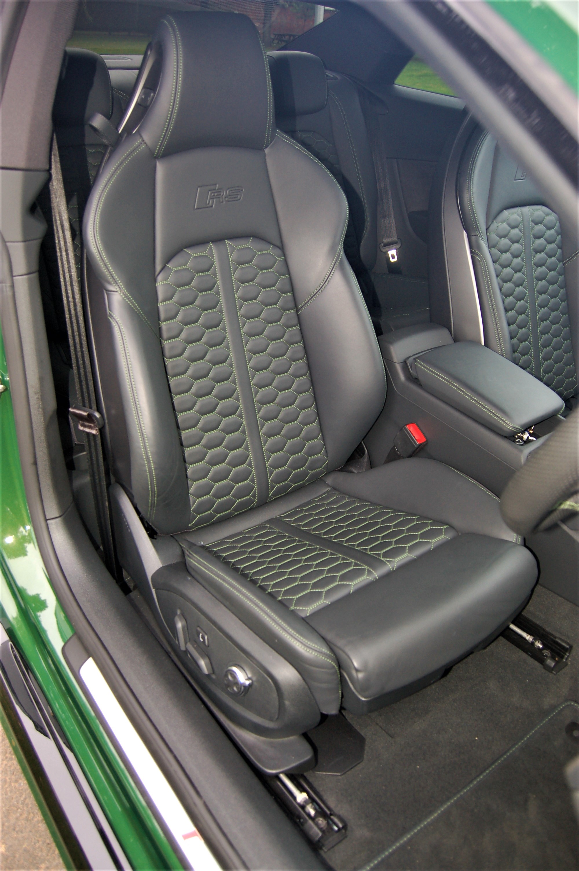 Of course, these teensy elements are only in support of a thoroughly British shade of jade that is one of Audi’s new colour combos for the RS5. The Nappa hide of the sleek coupe’s gorgeous diamond-stitched upholstery, is also picked out in green. Yet, it is what lies beneath the bonnet, displacing 2.9-litres in V6 format, producing 446bhp at between 5,700-6,700rpm, matched by an equally impressive 442lbs ft of torque developed between a lowly 1,900 to a punchy 5,000rpm, which has greatest appeal. Its massive trough of potency gifts the light RS5 a level of performance that verges on ludicrous.