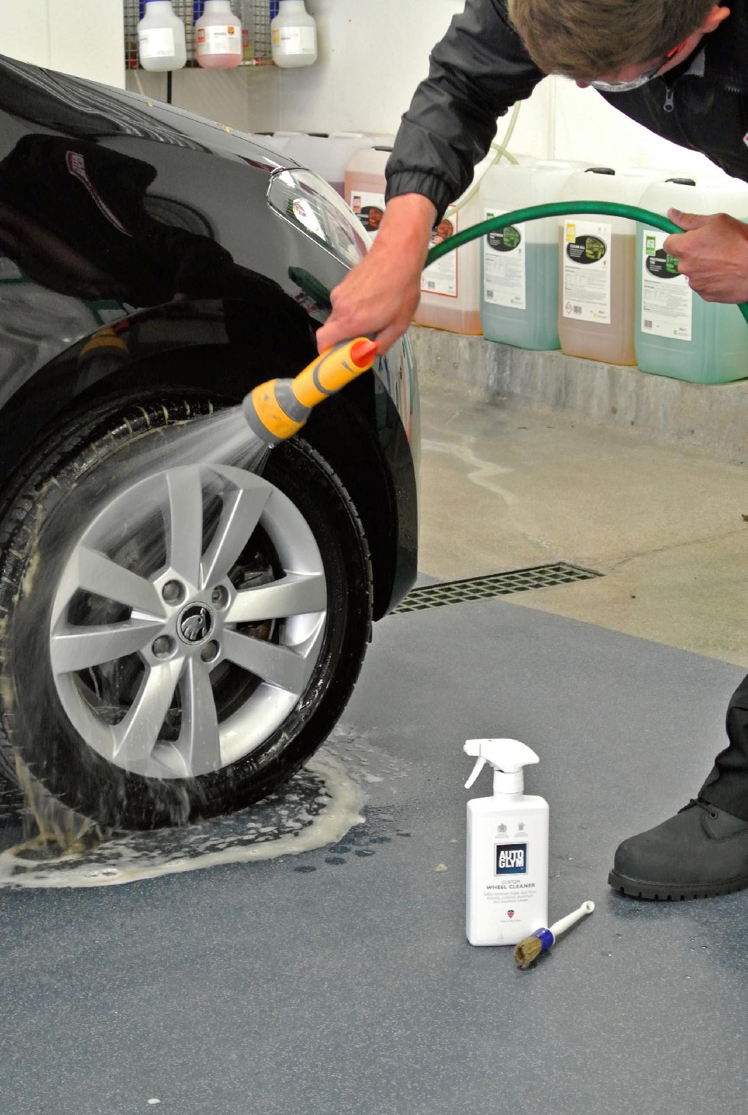 - Wheels – Hammered by a blend of brake dust, salt and road grit, use a proprietary wheel-cleanser, not forgetting to clean the inside edges too (which provides an opportunity to check the condition of your car tyres) and, once rinsed thoroughly, dry and apply a coat of wax to the surfaces.